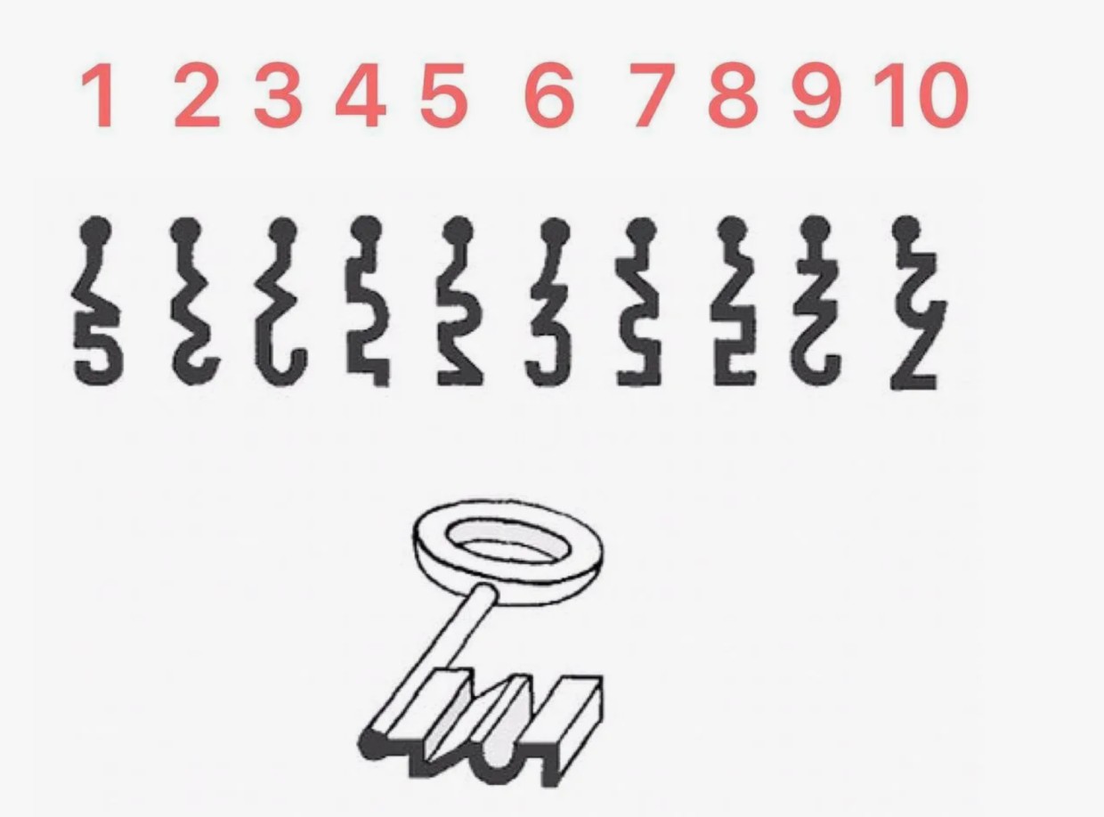 Перед вами — странный, изогнутый ключ с уникальными выступами и пазами. А ниже — 10 разных замочных скважин. Ваша задача — мысленно повернуть ключ, представить его форму и понять, к какой именно скважине он подойдёт идеально, без лишних зазоров и несовпадений.