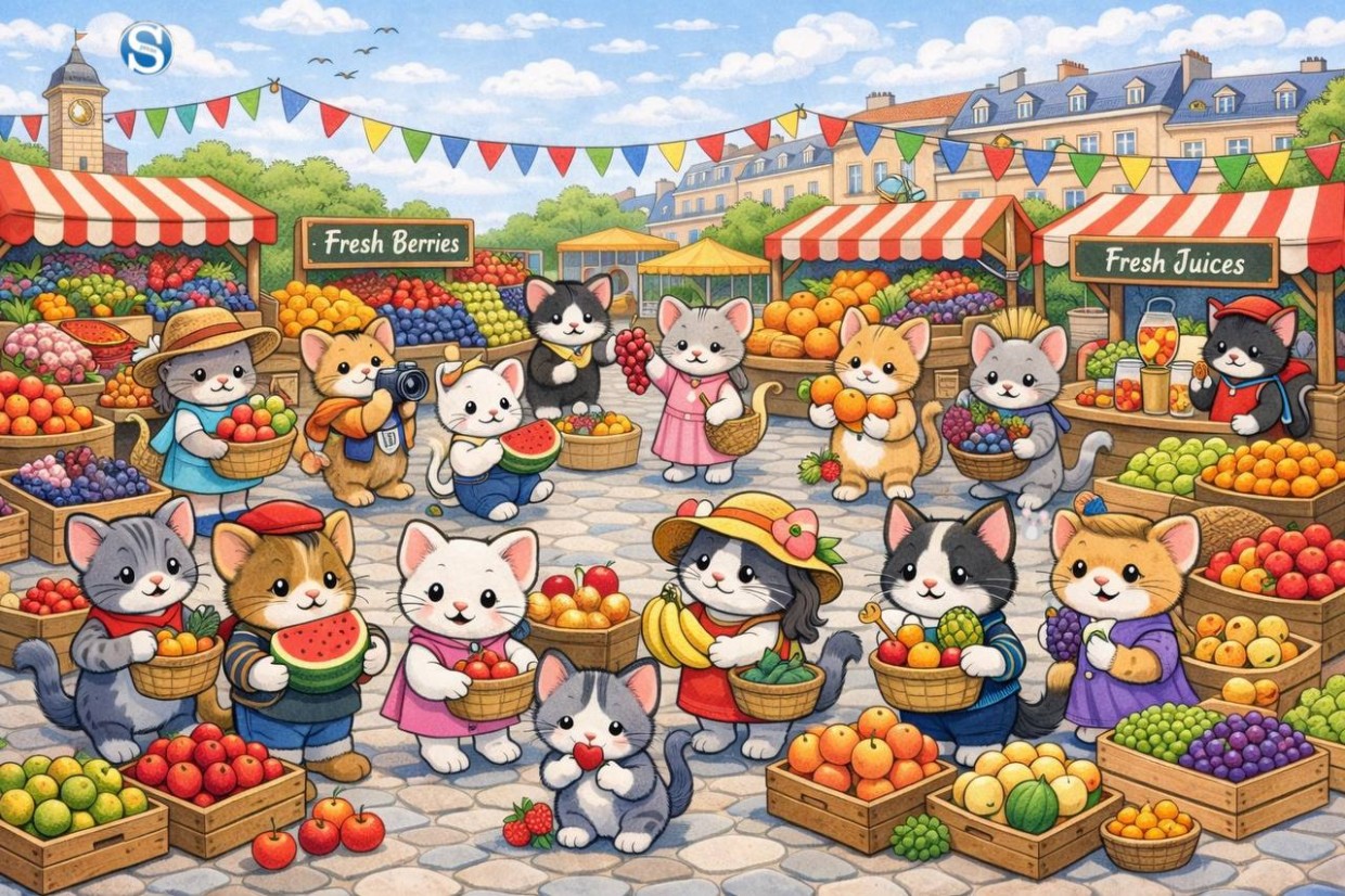 Представьте себе самый необычный рынок в мире: здесь пушистые коты-продавцы раскладывают сочные фрукты, ведут оживлённые торговые беседы и следят за порядком. Яркие краски, аппетитные яблоки и груши... Но тишина и гармония этого места обманчивы!