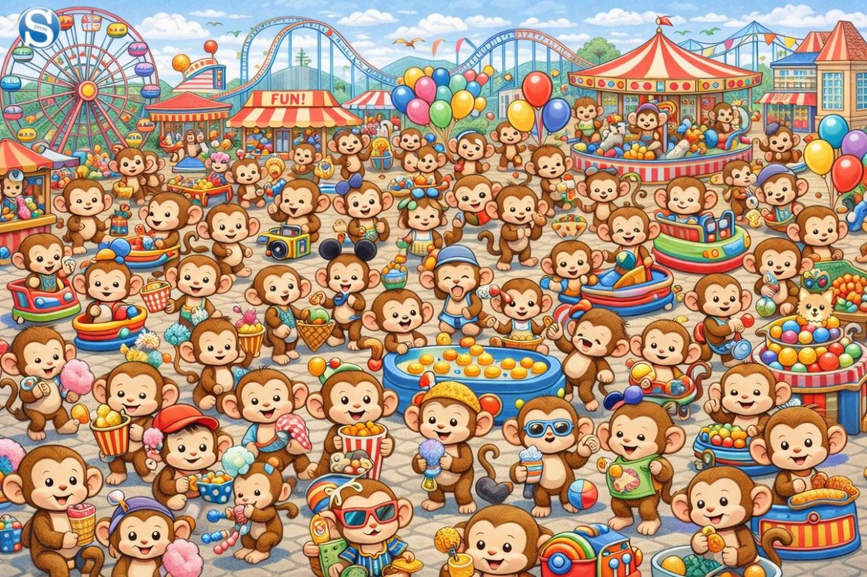 Перед вами — оживлённая картинка: обезьянки весело проводят время в парке развлечений, катаются на каруселях и едят сладкую вату. Но среди этой весёлой компании спрятался один щенок. Ваша задача — обнаружить его всего за 5 секунд!