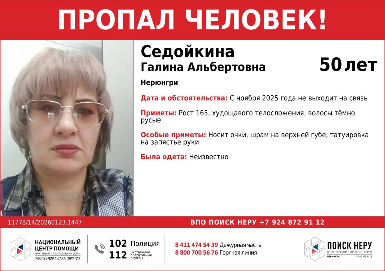 В Нерюнгри вот уже третий месяц не могут найти 50-летнюю Галину Седойкину. Она перестала выходить на связь в ноябре 2025 года, и с тех пор её местонахождение остаётся неизвестным. Информацию о пропаже Sakhapress подтвердили в республиканском мониторинговом Центре помощи пропавшим и пострадавшим.