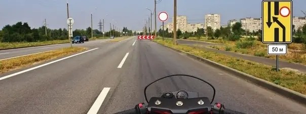 Знак 6.19.1 «Предварительный указатель перестроения на другую проезжую часть» указывает направление объезда, закрытого для движения участка проезжей части на дороге с разделительной полосой. Жёлтый фон знака обозначает, что объезд временный. («Дорожные знаки»)