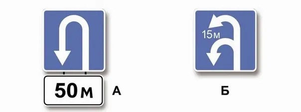 Знак «Б» – 6.3.2 «Зона для разворота» применяется для обозначения места на участке дороги, разрешающего разворот, и его протяжённость. В данном случае протяжённость зоны для разворота – не более 15 м. Комбинация знаков «А» – 6.3.1 «Место для разворота» и табличка 8.1.1 «Расстояние до объекта» указывают, что через 50 м от установки знаков по ходу движения будет находиться место, предназначенное только для выполнения разворота. Протяжённость зоны разворота в данной ситуации не оговаривается. («Дорожные знаки»)