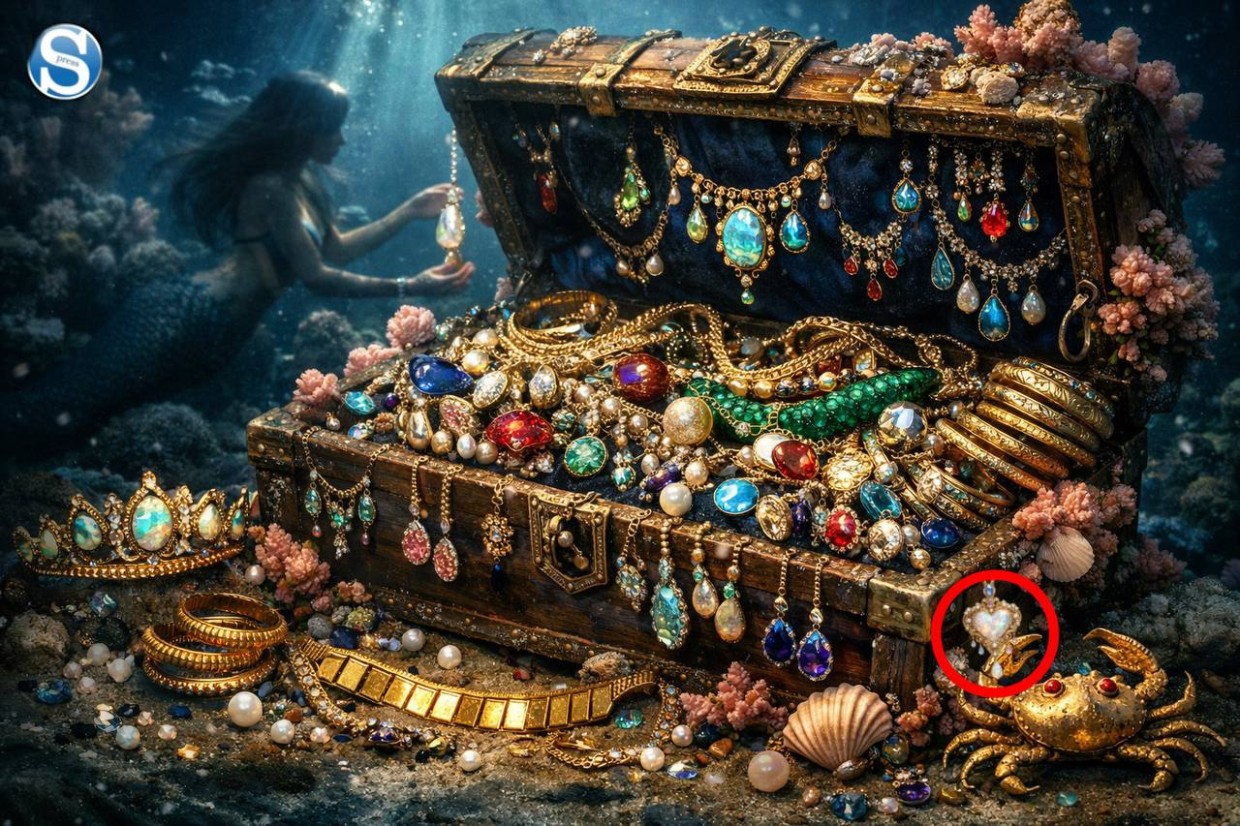 Перед вами — красочное изображение с множеством морских украшений: ракушки, жемчуг, звёзды, водоросли. Среди них спрятана подвеска в форме сердца. Ваша задача — найти её всего за 5 секунд!