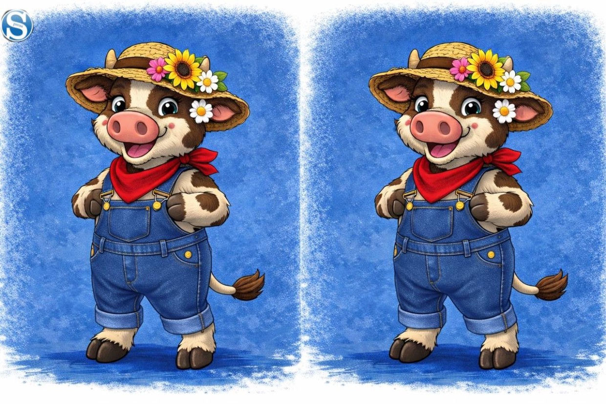Перед вами две забавные картинки с коровкой-фермером, которая собралась на работу. Они кажутся идентичными, но одна деталь всё же отличается. Ваша задача — найти это отличие всего за 10 секунд!