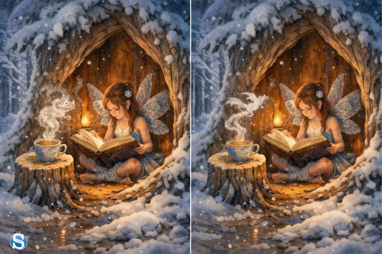 Правила просты: Посмотрите на две картинки с феей, читающей волшебную книгу. Они кажутся идентичными, но это не так!