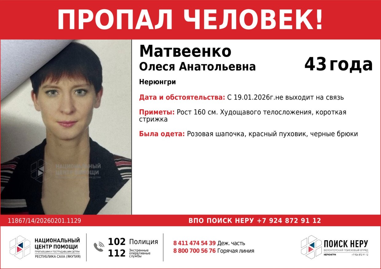В Нерюнгри уже третью неделю не могут найти 43-летнюю Олесю Матвеенко. Она перестала выходить на связь с 19 января 2026 года. С тех пор её местонахождение остаётся неизвестным.