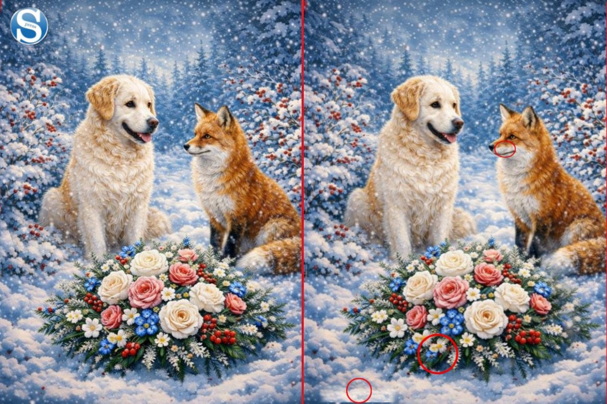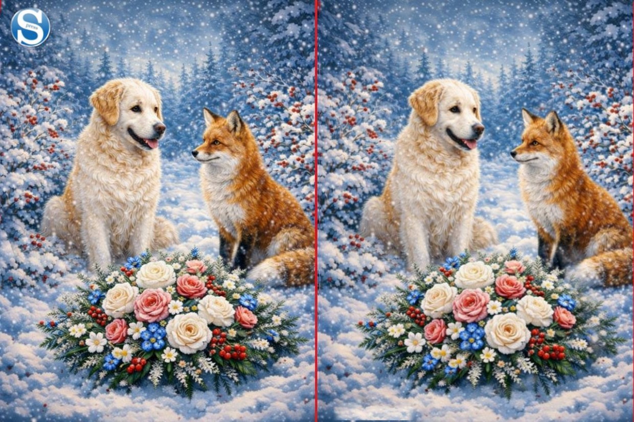Зимняя головоломка: найдите все отличия на картинке с собакой и лисой за 10 секунд