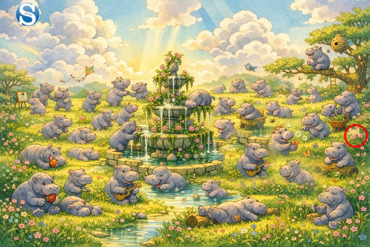 Перед вами — умиротворённая сцена: группа бегемотов отдыхает у фонтана. Но художник Sakhapress спрятал среди них ещё одного зверька - хитрую лисичку. Ваша задача — найти этого «незваного гостя» всего за 10 секунд.