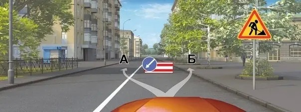 Знаки имеют приоритет над разметкой. Поэтому согласно знаку 4.2.2 «Объезд препятствия слева» Вы должны продолжить движение по траектории «А». («Дорожные знаки», «Горизонтальная разметка»)