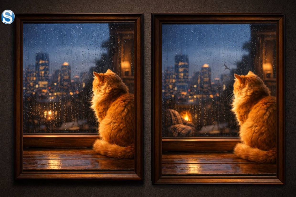 Найди три отличия на картинке: Рыжий кот на подоконнике, дождь и вечерний мегаполис