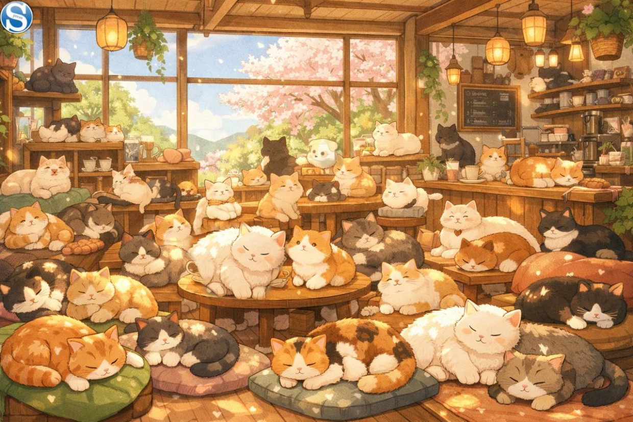 Перед вами уютная кофейня, где за столиками расположились пушистые посетители. Мурлыкающие гости пьют латте, нежатся на подушках и лениво щурятся. Но есть одна проблема: в это кошачье царство случайно забрел маленький щенок. И теперь он отчаянно пытается замаскироваться, чтобы не быть обнаруженным.