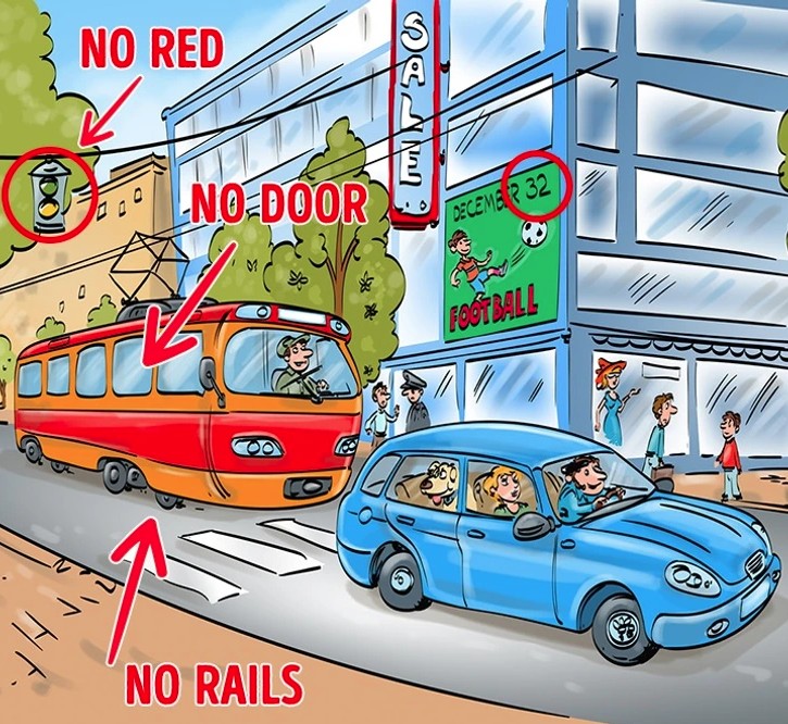 На картинке №2 у светофора нет красного сигнала, у трамвая нет дверей, на дороге нет рельсов, а футбольный матч состоится аж 32 декабря...