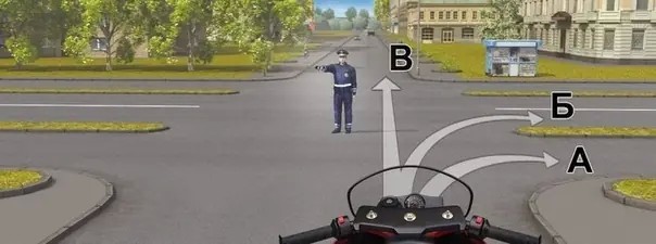 Действия регулировщика распространяются на то пересечение проезжих частей, на котором он находится. Будем считать, что он находится на первом пересечении. Со стороны вытянутой руки безрельсовым транспортным средствам разрешается движение только направо. Можно продолжить движение только по траектории «А».