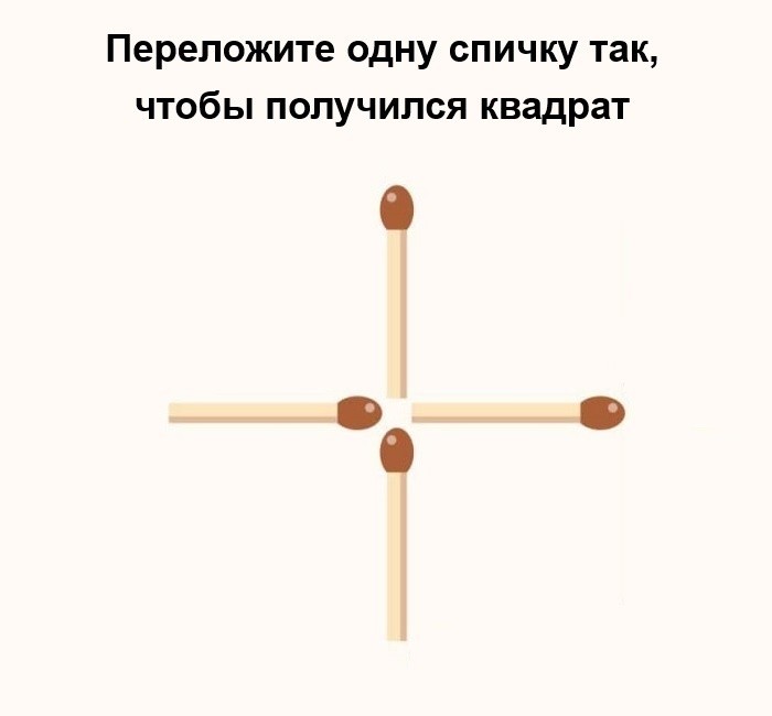 На картинке (см. выше) из четырёх спичек выложена фигура. На первый взгляд это не квадрат, а что-то иное. Однако, если переложить всего одну спичку, можно получить квадрат.