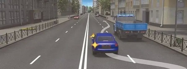 Фаза 2: Движение в левом ряду параллельно грузовику. Сигналы включать не нужно, так как вы не меняете траекторию.