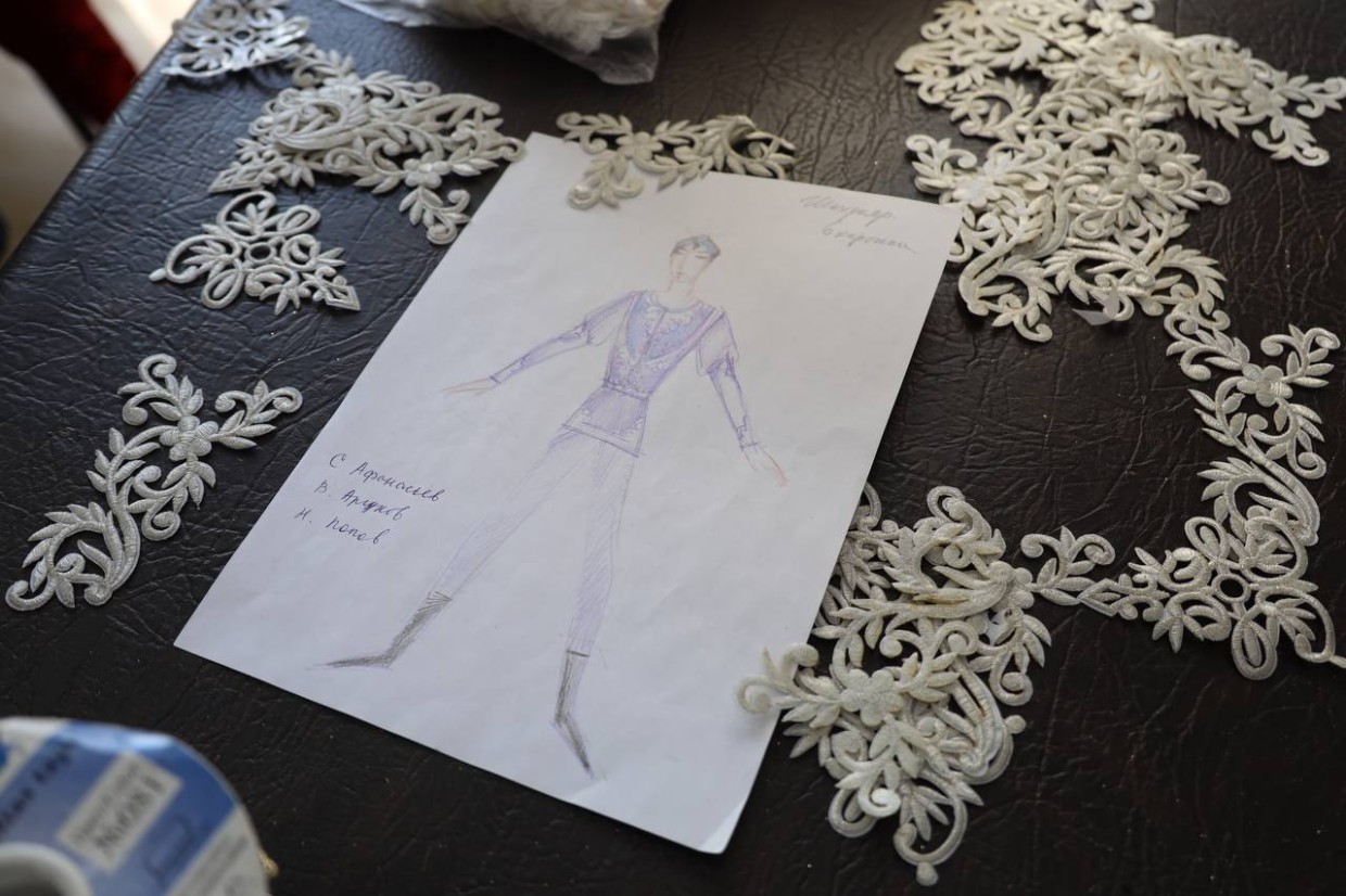 Пока закройщица Алина Яковлева вместе с модельером Юрием Лукиным работали над роскошными женскими костюмами, вручную украшая их золотой и серебряной вышивкой, бисером, пайетками и стразами, в мужской части мастерских главный художник нового балета вместе с закройщицей Татьяной Егоровой порхали вокруг манекена в жгуче-восточном костюме грозового цвета, то и дело примеряя к нему гипюр цвета ночного неба.