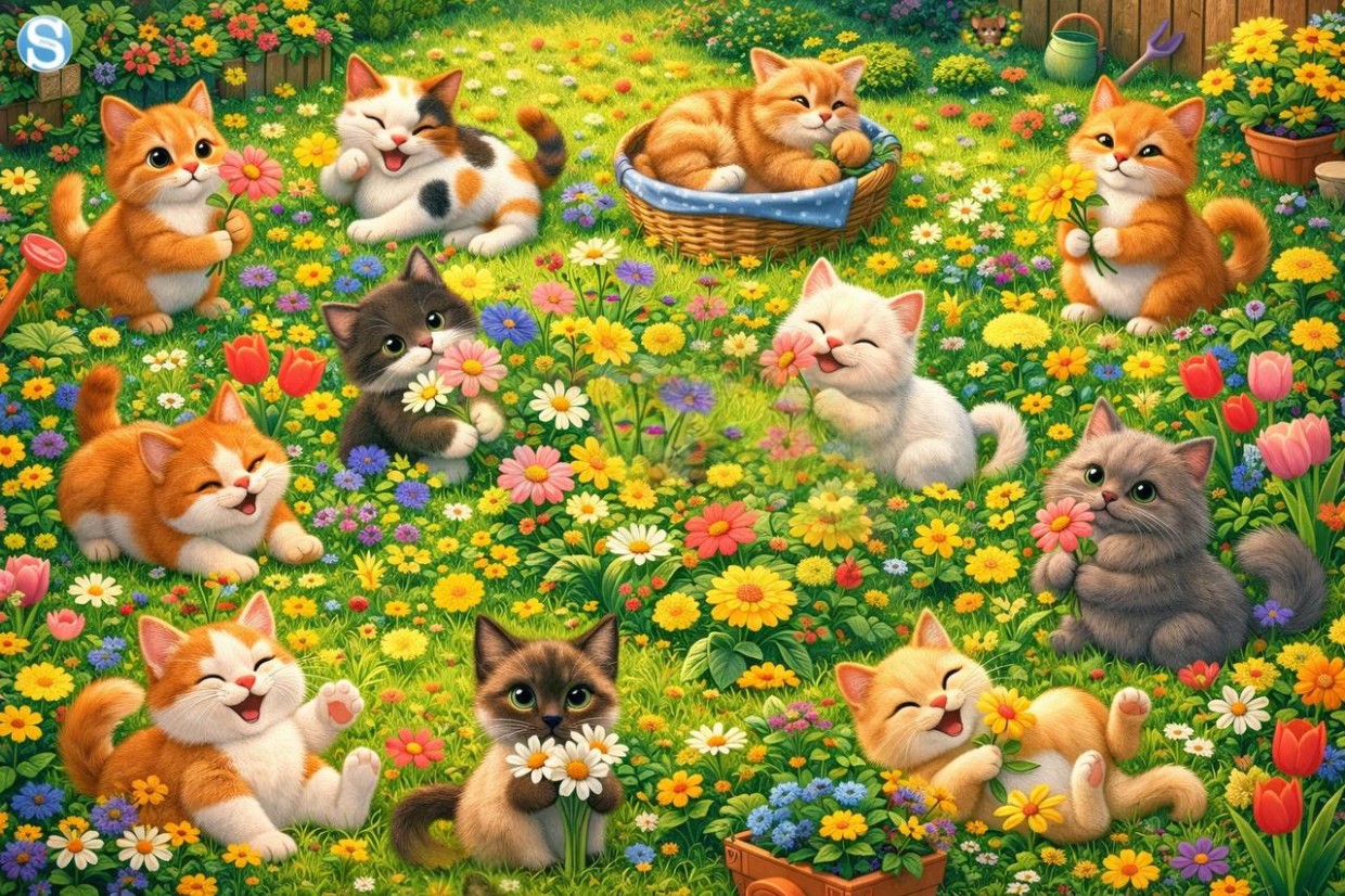На картинке: уютный сад, множество котиков в разных позах и одна маленькая мышка, которую нужно обнаружить.