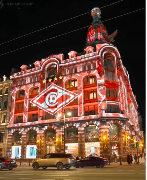 В ночь на 18 апреля 2026 года один из главных архитектурных символов Санкт-Петербурга — Дом Зингера на Невском проспекте — неожиданно окрасился в красно-белые цвета. Официальный телеграм-канал московского «Спартака» опубликовал видео, на котором на фасаде знаменитого Дома книги появляется огромная проекция с эмблемой клуба.