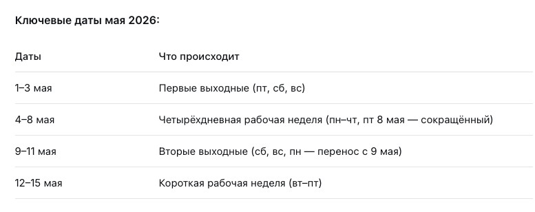 В мае 2026 года россиян ждут две короткие рабочие недели и два периода отдыха по три дня. Первые выходные — с 1 по 3 мая (пятница, суббота, воскресенье). Вторые — с 9 по 11 мая (суббота, воскресенье, понедельник), так как 9 мая выпадает на субботу, и выходной переносится на понедельник.
