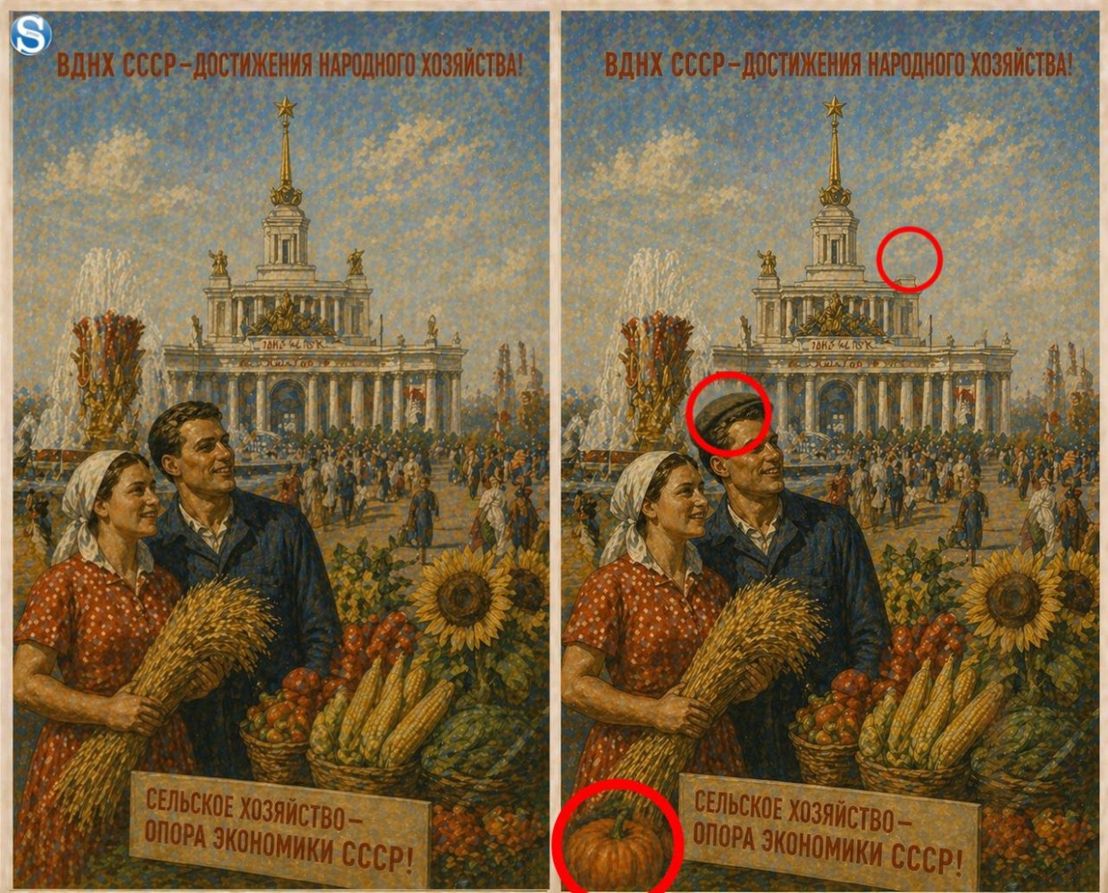 Тест на внимательность времен СССР: найдите три отличия на картинке с советскими колхозниками