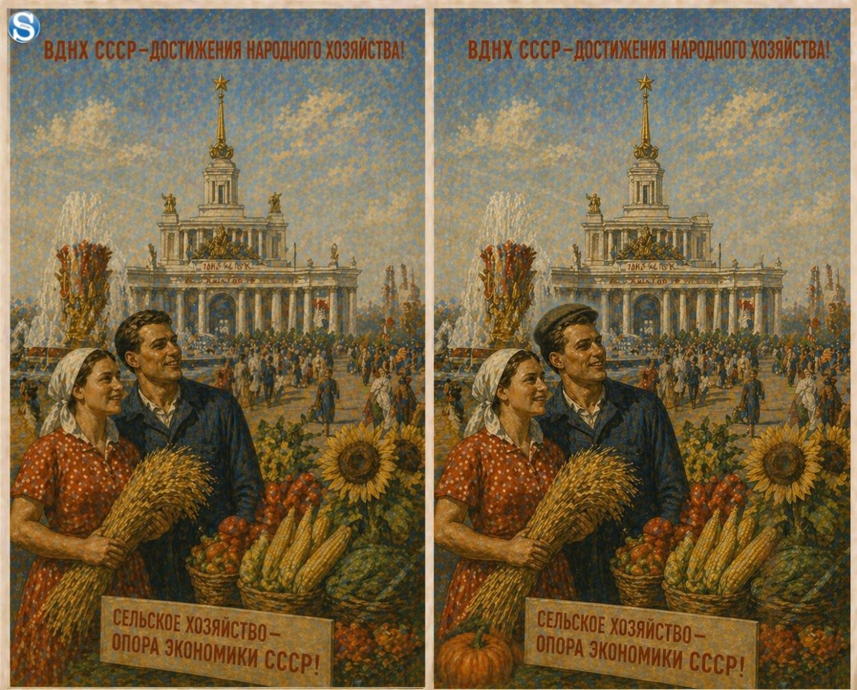На ВДНХ — советские колхозники с богатым урожаем. Это фото могло украшать страницу районной газеты «За передовую жатву» или висеть в красном уголке сельсовета. Но художник Sakhapress решил измениnm две, казалось бы, одинаковые картинки.