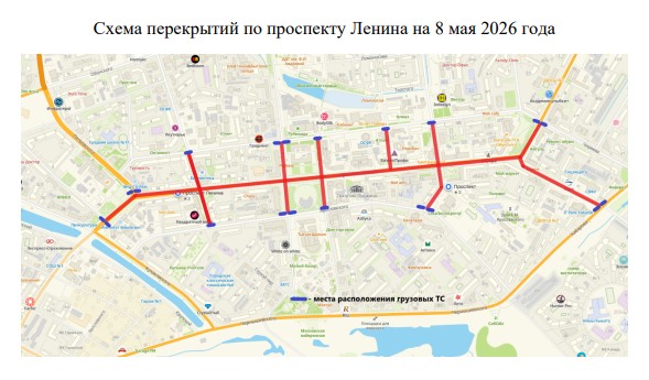 8 мая 2026 года в центральной части города по проспекту Ленина будет ограничение движения транспорта c 08:30 до 14:00 часов по следующим улицам: