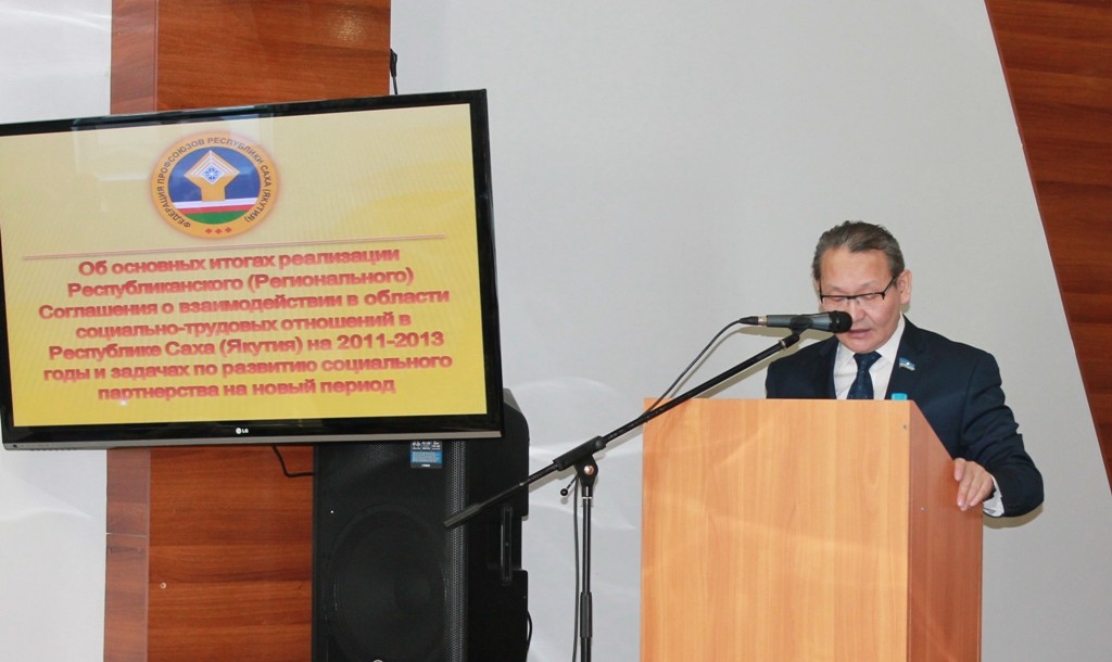 РИГ SAKHAPRESS.RU В работе V заседания Совета Федерации профсоюзов РС (Я), состоявшегося 4 апреля, приняли участие свыше 100 человек – члены Совета и приглашенные. С информацией по вопросу об основных итогах реализации Республиканского (регионального) соглашения о взаимодействии в области социально-трудовых отношений в Республике Саха (Якутия) между Правительством Республики Саха (Якутия), Федерацией профсоюзов Республики Саха (Якутия) и Республиканскими объединениями работодателей на 2011-2013 годы и задачах по развитию социального партнерства на новый период выступил