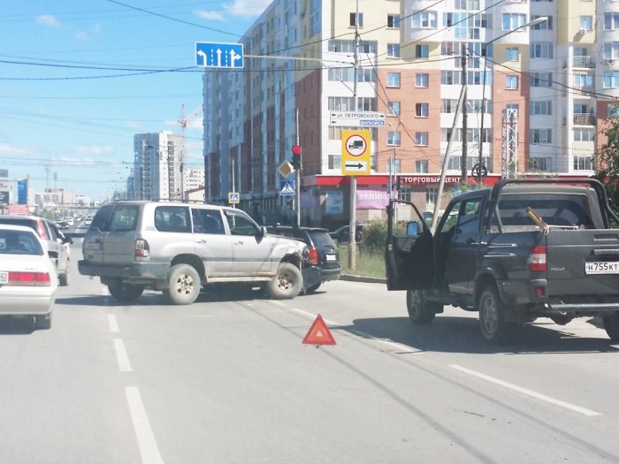РИГ SAKHAPRESS.RU В субботу около полудня, 28-летний водитель автомашины «Тойота Ланд Крузер», двигаясь по ул. Лермонтова в сторону ул. Петровского, совершил наезд на автомашину «Хонда Фит», которая остановилась на регулируемом пешеходном переходе на запрещающий сигнал светофора. После чего водитель внедорожника попытался скрыться с места происшествия, но через пару метров совершил столкновение с автомобилем «Тойота Королла Филдер». В результате ДТП, 69-летняя пенсионерка, сидевшая на переднем пассажирском сидении автомобиля «Хонда Фит», получила ушиб мягких тканей затылочной области. Прибывшие на место происшествия инспектора ДПС установили, что задержанный, кроме того, что не имел права управления транспортными средствами, находился в сильном алкогольном опьянении. За отказ от медицинского освидетельствования, в отношении нетрезвого водителя, в присутствии двух понятых, был составлен административный протокол по статье 12.26. ч. 1 КоАП РФ.