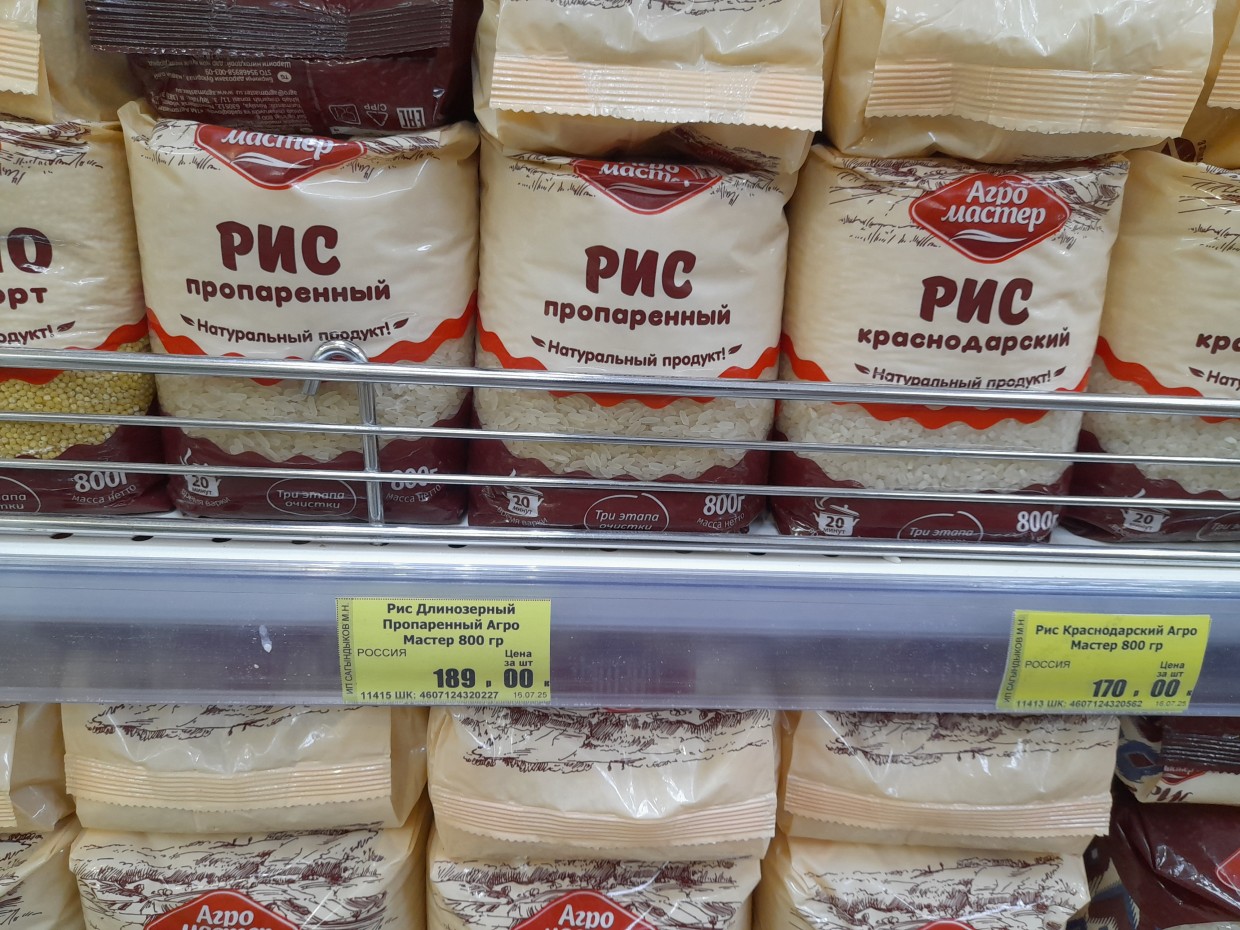 Итак, в этом универсаме достаточно большой ассортимент разных продуктов. Все необходимое по списку купить можно. В какую сумму обойдется наш набор необходимых продуктов? Итак, масло подсолнечное «Sunny Gold» по цене 186 рублей, килограмма сахара 106 рублей, рис длиннозерный от «Агромастер» по 168 рублей, пакет гречки «Алтайская» по 111 рублей.