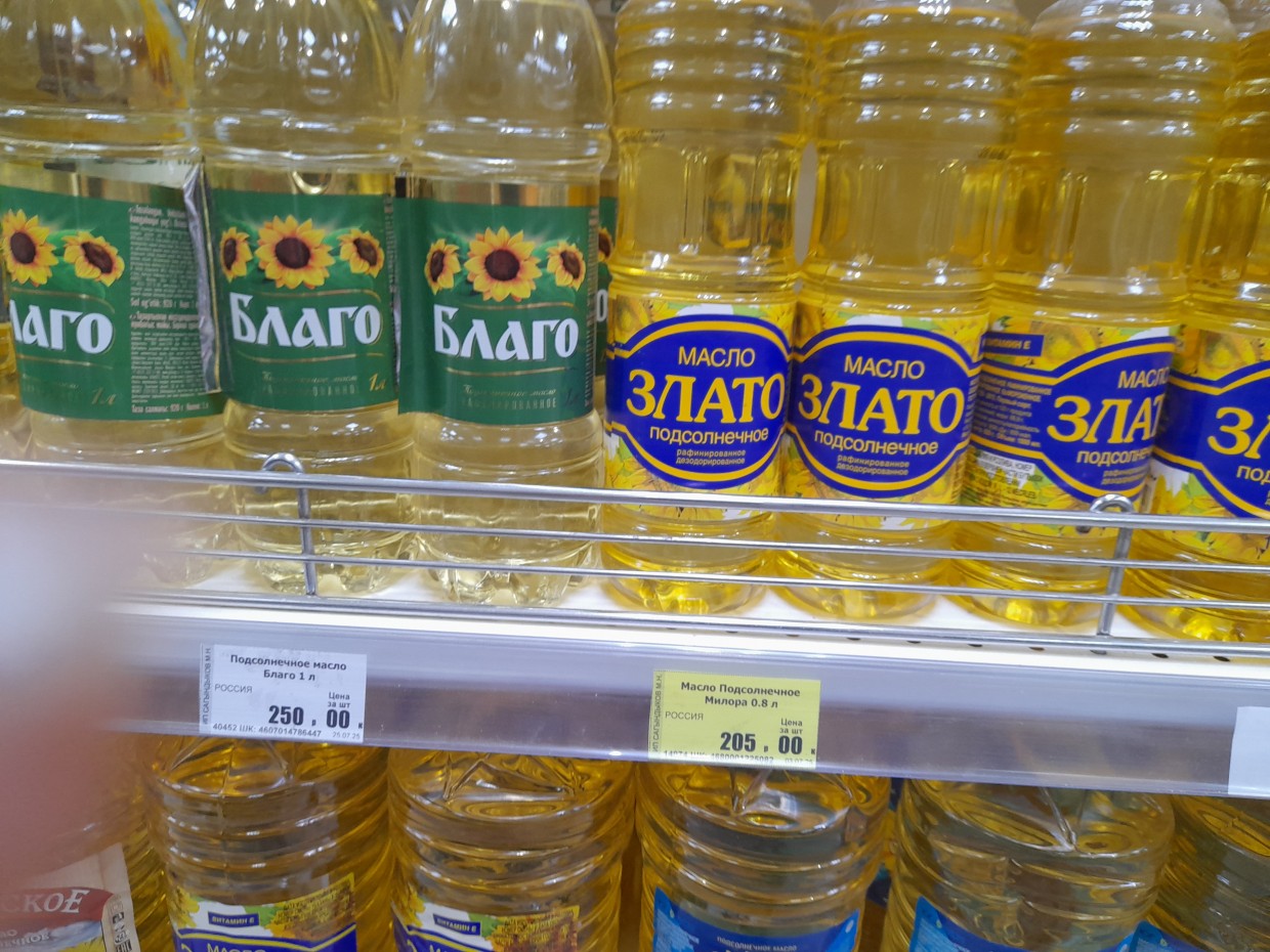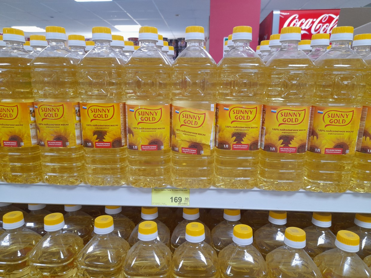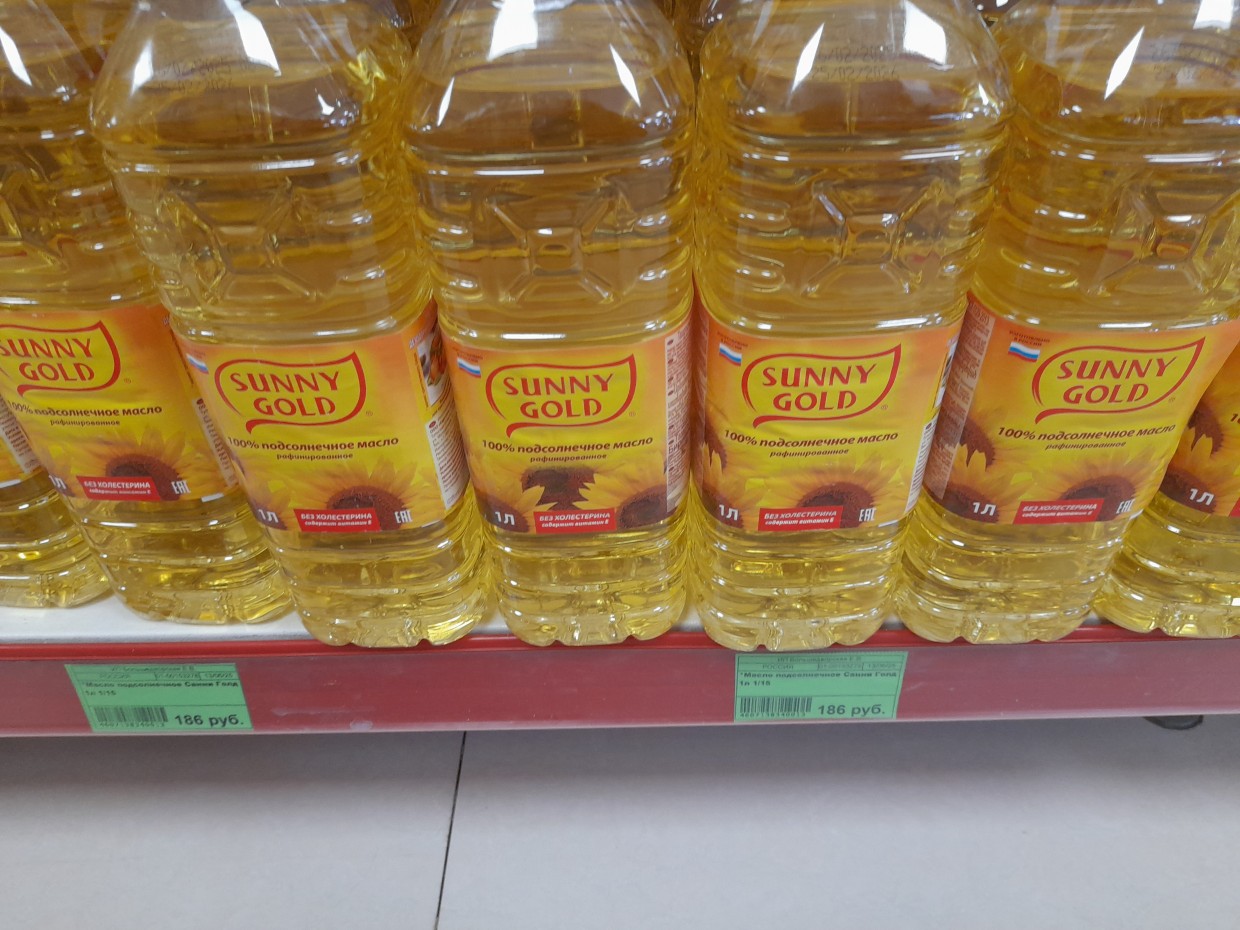 В этом гипермаркете очень много разных продуктов, что разбегаются глаза. Но не забываем, что мы должны купить только самые необходимые продукты и уложиться в 2 000 рублей. Итак, в этом гипермаркете смотрим на цены продуктов из списка. Первым делом нужно обязательно купить подсолнечное масло «Sunny Gold» (1 литр) и в этом гипермаркете его продают по цене 169 руб. 90 копеек.