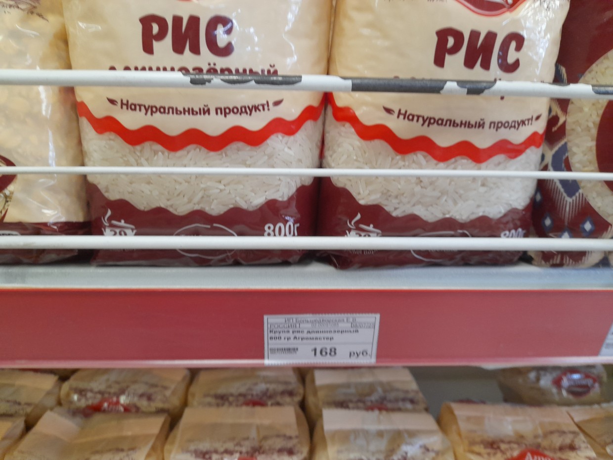 Также покупаю килограмм сахара (110 рублей), еще обязательно нужен рис, выбираю пакет (900 грамм) по цене 157 рублей. А также нужна гречка, пакет (800 грамм) стоит здесь 105 рублей 60 копеек. Макароны «Макфа» по 108 рублей. Мясо тоже закончилось, но рис и гречку можно вполне приготовить с тушенкой. Здесь банка говядины тушеной (ГОСТ «Бурятмяспром») стоит 209 рублей 90 копеек. Также обязательно нужно купить чай пакетированный («Принцесса Нури» высокогорный из 25 пакетиков стоит 78 рублей). Для стряпни блинов или оладушек нужны яйца, здесь десяток яиц стоит 74 рубля 90 копеек.