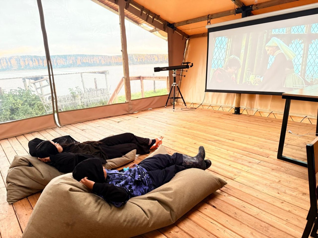 Вечером для взрослых — горячая банька, а дети расположились у проектора за просмотром «Гарри Поттера».