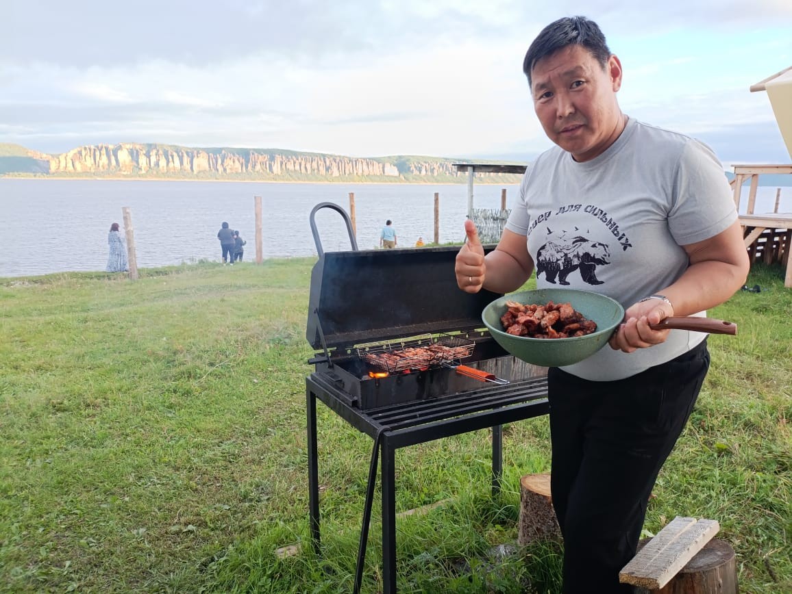 У турбазы своя костровая зона, мангал, есть электрический чайник и плитка. Главное, правильно закупиться продуктами — мясо, овощи, крупы, фрукты, колбаса, хлеб, питьевая вода. Сумма вышла на 4 000 рублей (спойлер: много чего обратно привезли в Якутск).