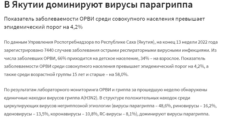 Вчера местные СМИ сообщили, что в Якутии начал распространяться гонконгский грипп. Отмечалось без ссылок на официальные источники, что есть подтвержденные случаи заболевания гриппом А (H3N2). При этом была частично использована информация от Роспотребнадзора РС(Я).