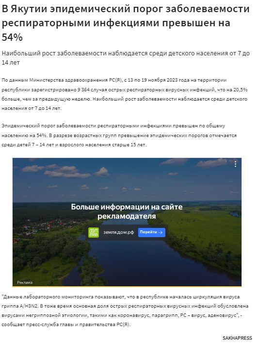 Sakhapress напоминает, что, по данным Управления Роспотребнадзора по РС(Я), на конец 43 недели 2025 года в пейзаже циркулирующих вирусов отмечены находки вирусов гриппа А (H3N2). О том, что есть случаи заболевания, таких данных там нет.
