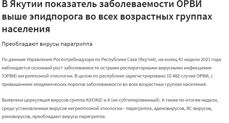 "Управление Роспотребнадзора по Республике Саха (Якутия) по рассылаемой информации о гонконгском гриппе сообщает о том, что в республике регистрируется сезонный подъем заболеваемости ОРВИ, в среднем еженедельный прирост составляет 17%. С 41 недели текущего года отмечается циркуляция вирусов гриппа. Еженедельно в медицинских организациях республики проводится до 10 тысяч исследований на грипп и ОРВИ. Тип штамма вируса гриппа определяет и подтверждает ФБУН ГНЦ ВБ «Вектор». Результаты полученных анализов за 43 неделю текущего года свидетельствуют о циркуляции вируса гриппа А(H3N2) без какого-либо упоминания о принадлежности к гонконгскому гриппу".