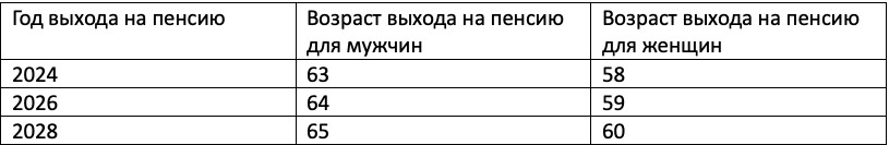 В настоящее время в России продолжается переходный период пенсионной реформы, которая началась в 2019 году и должна полностью завершиться к 2028 году. В соответствии с ней возраст выхода на пенсию постепенно повышается на 5 лет.