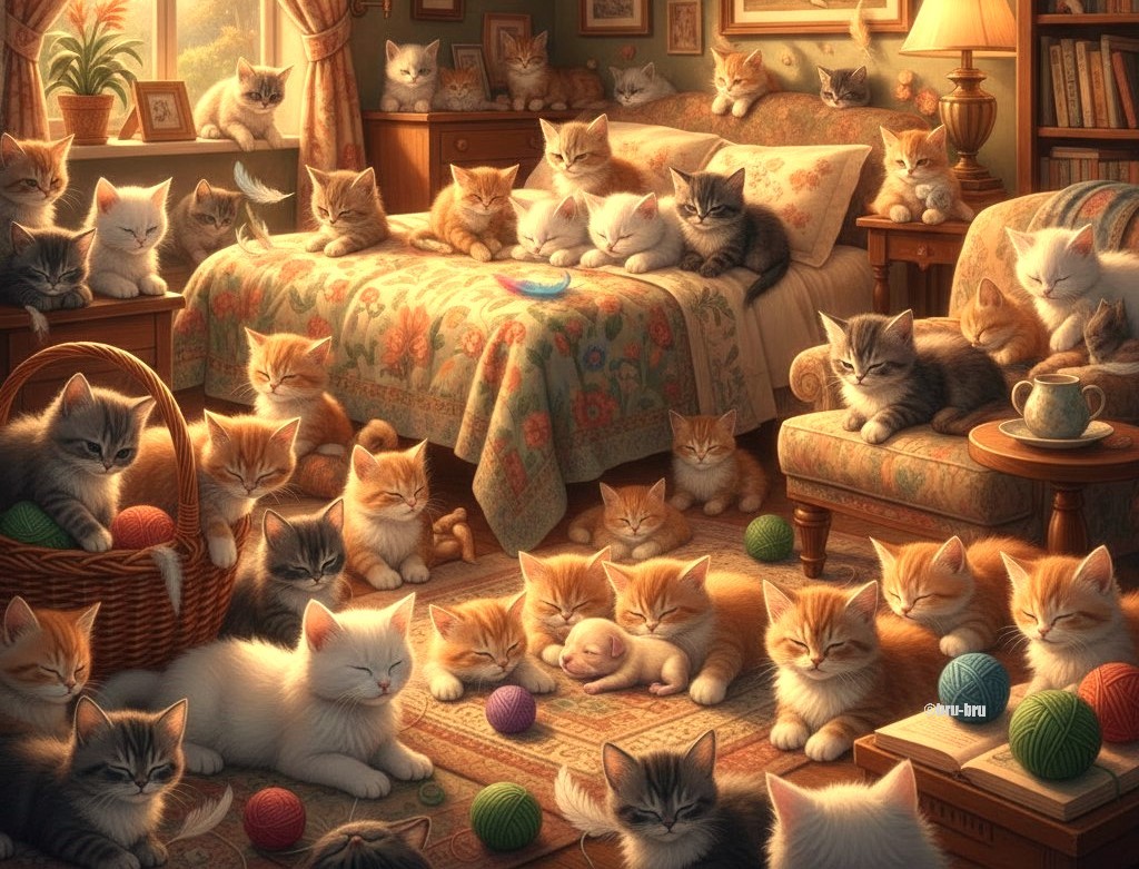 Задача: На этой уютной картинке мило спят много кошек и котят. Ваша задача — сходу найти щеночка! Постарайтесь сделать это за 5 секунд — именно так мы проверяем быстроту реакции вашего мозга. Готовы? Начинайте прямо сейчас!