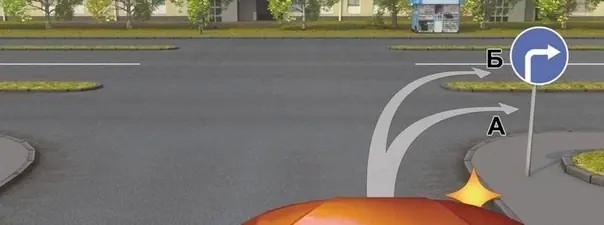 Комментарий: Разделительные полосы делят дорогу на смежные проезжие части. Действие знака 4.1.2 «Движение направо», установленного перед пересечением проезжих частей, распространяется на первое пересечение. Можете продолжить движение только по траектории «А». (Пункт 1.2 термин «Разделительная полоса», «Дорожные знаки»)