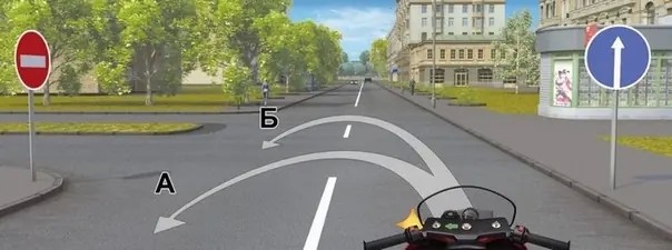 Комментарий: Действие знака 4.1.1 «Движение прямо» в случае установки его перед пересечением проезжих частей, распространяется только на первое пересечение за знаком. Вы можете выполнить разворот по траектории «Б». («Дорожные знаки»)