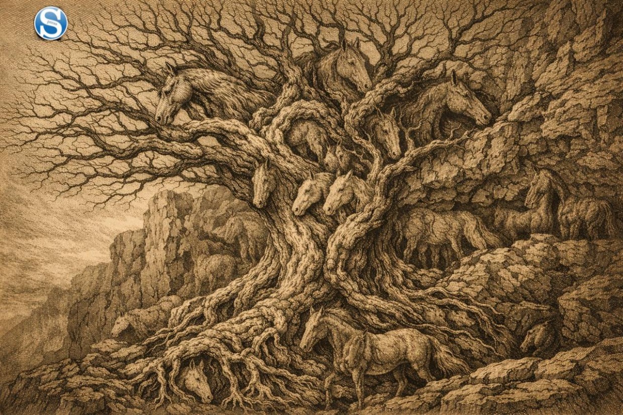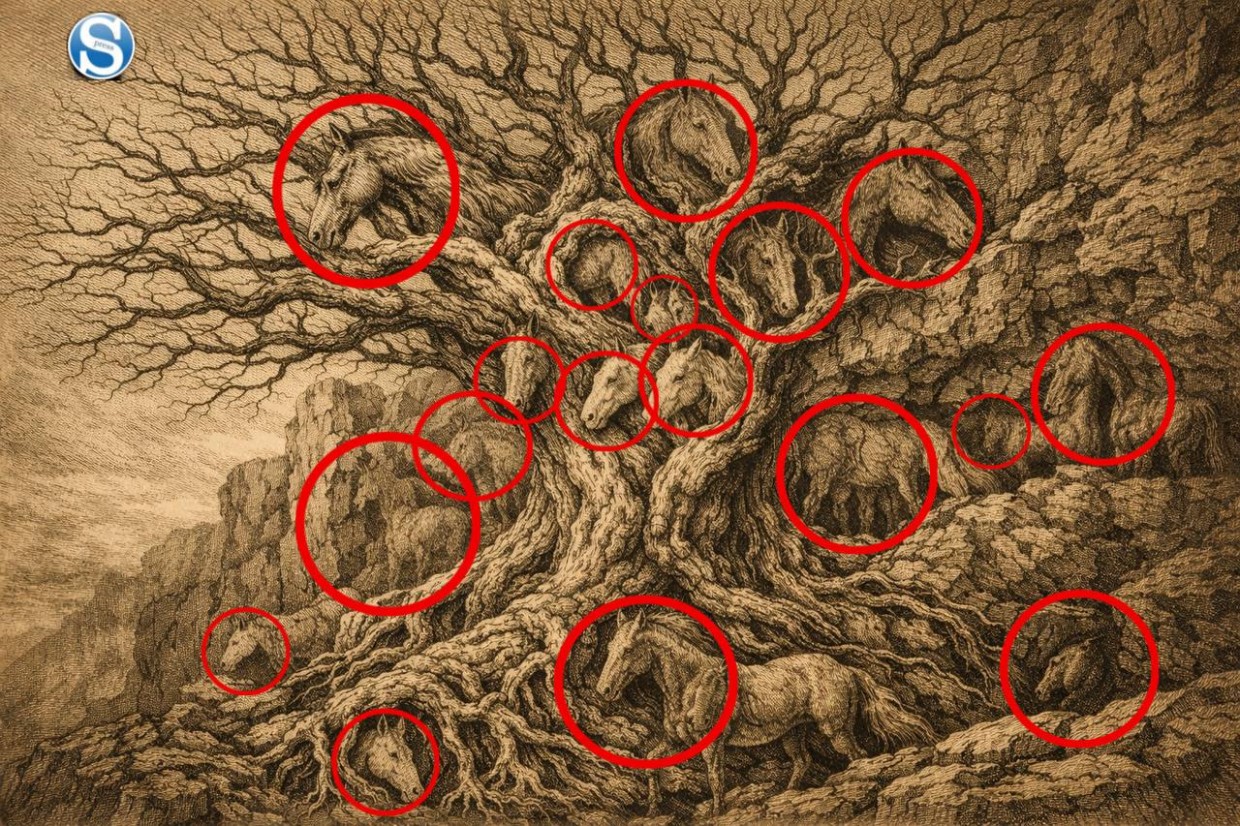 Задание: Внимательно изучите изображение. Среди ветвей старого дерева, скал и теней спрятаны лошади. Ваша задача — найти их всех всего за 10 секунд!