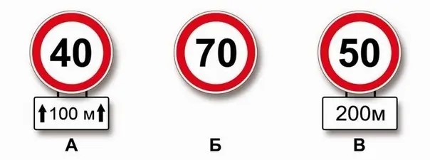Комментарий: Действие запрещающего знака 3.24 «Ограничение максимальной скорости» распространяется от места установки до ближайшего перекрёстка, а при отсутствии перекрёстка - до конца населённого пункта («Б»). Зона действия может ограничиваться, например, табличкой 8.2.1 «Зона действия» («А»).3нак действует 100 м от его места установки. Табличка 8.1.1 под знаком («В») «Расстояние до объекта» указывает расстояние от знака до места начала его действия. («Дорожные знаки»)