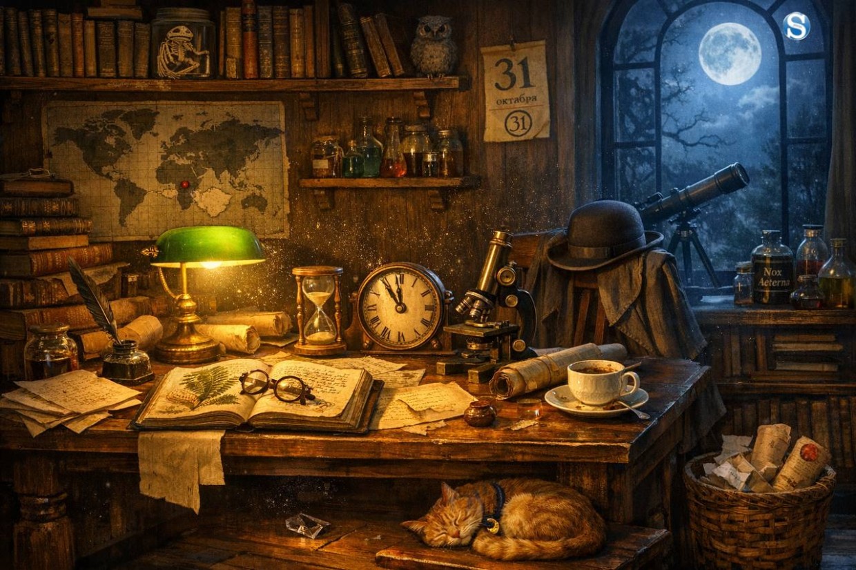 2. Дата на календаре: 31 октября (Хэллоуин — идеальная дата для алхимической лаборатории!).