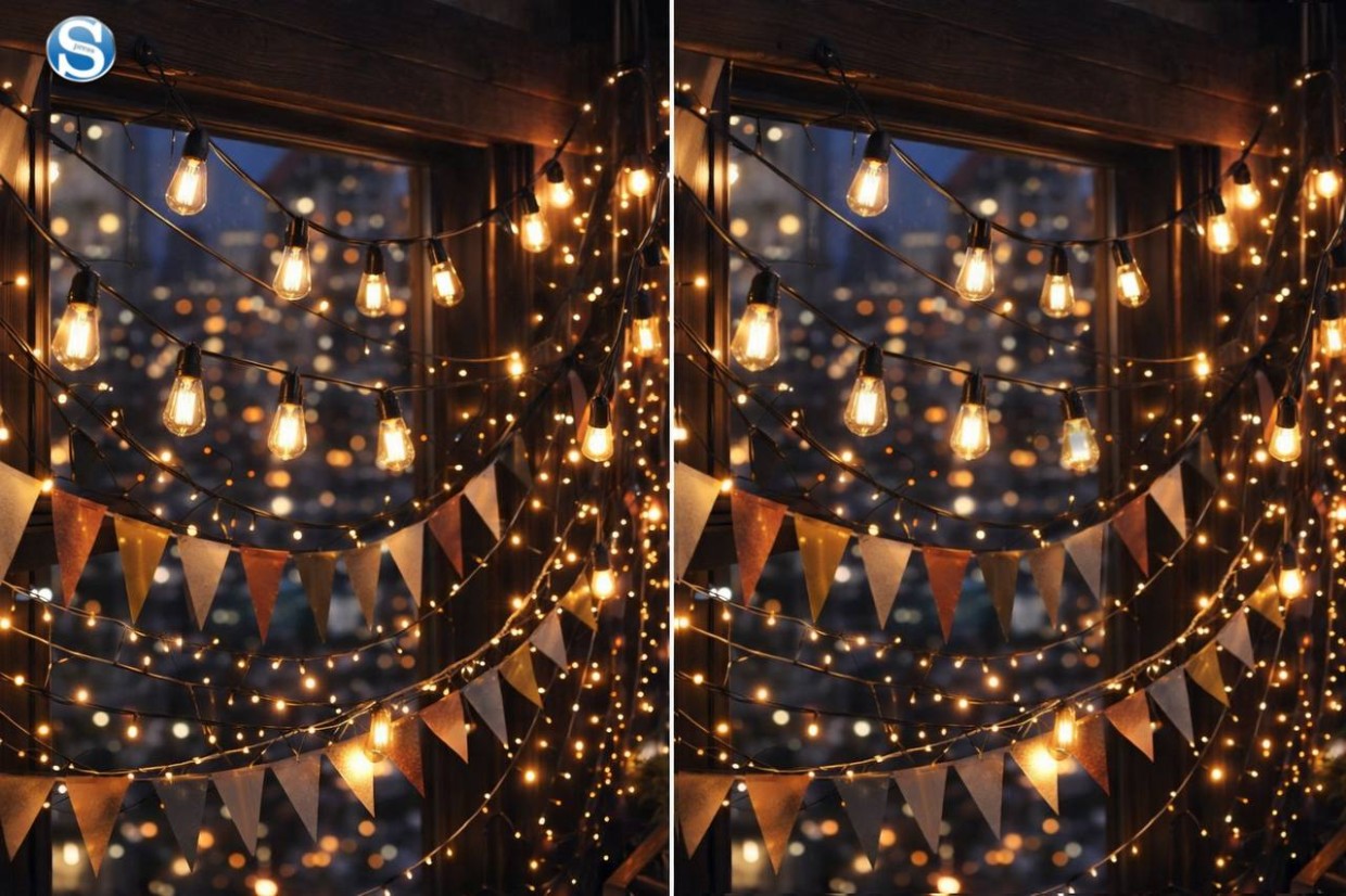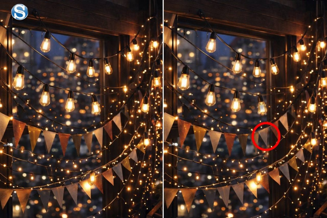 Перед вами два ярких, детализированных изображения праздничного окна с флажками, огоньками и декором. Они выглядят идентично, но одна деталь всё же отличается. Ваша задача — найти это отличие всего за 10 секунд!