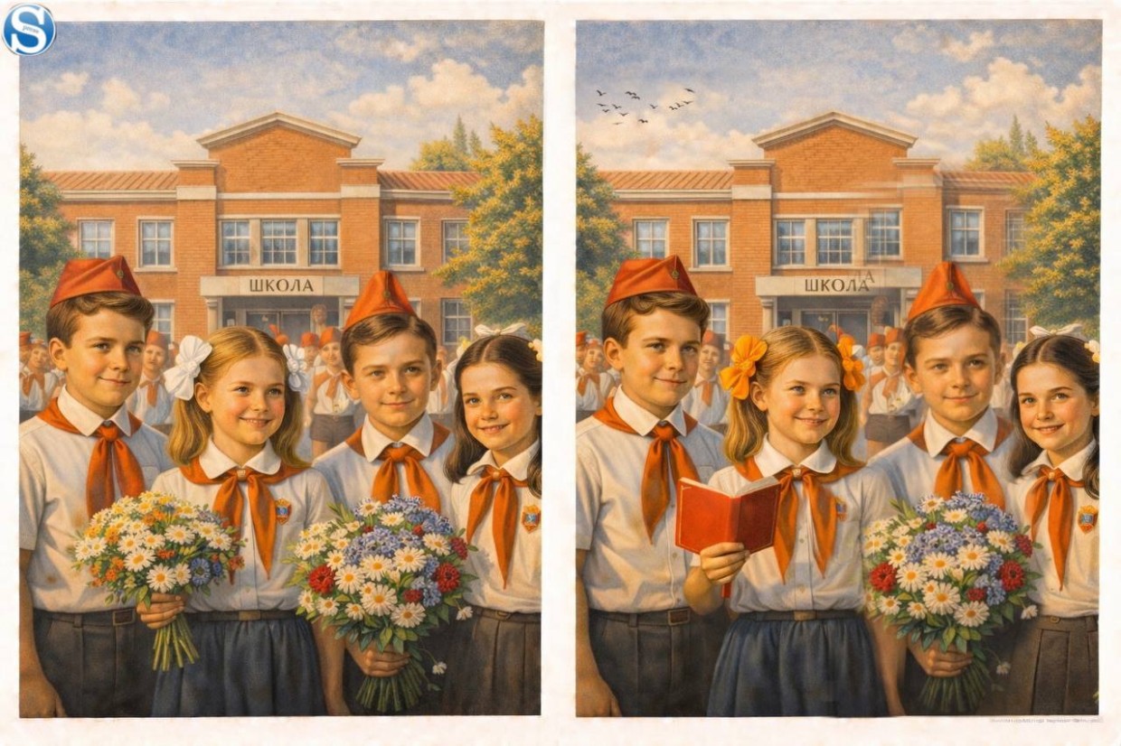 Перед вами сцена из советского прошлого: школьники в строгой форме — мальчики в красных пилотках, девочки с галстуками и бантами. На заднем плане — типичная советская школа. Знакомая картина для всех, кто учился в СССР.