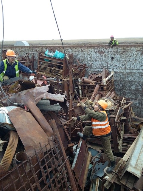 В компании "Алмазы Анабара" за многие годы работы твердо устоялась традиция: на месте своей деятельности наводить чистоту и порядок. С помощью автокранов, тягачей, бульдозеров заржавевшее многотонное железо собирают в месте хранения, затем разрезают на более мелкие куски, прессуют, перевозят и складировали в специально отведенном месте у причала.