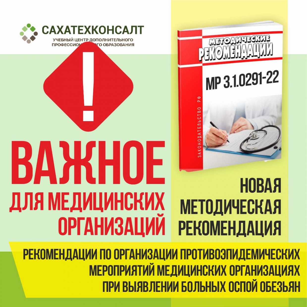 ООО «Сахатехконсалт» информирует Вас о направлении МЗ РФ регионам новой методической рекомендации МР 3.1.0291-22 «Рекомендации по организации противоэпидемических мероприятий медицинских организациях при выявлении больных оспой обезьян (лиц с подозрением на заболевание)» (утв. Федеральной службой по надзору в сфере защиты прав потребителей и благополучия человека 3 июня 2022 г.).