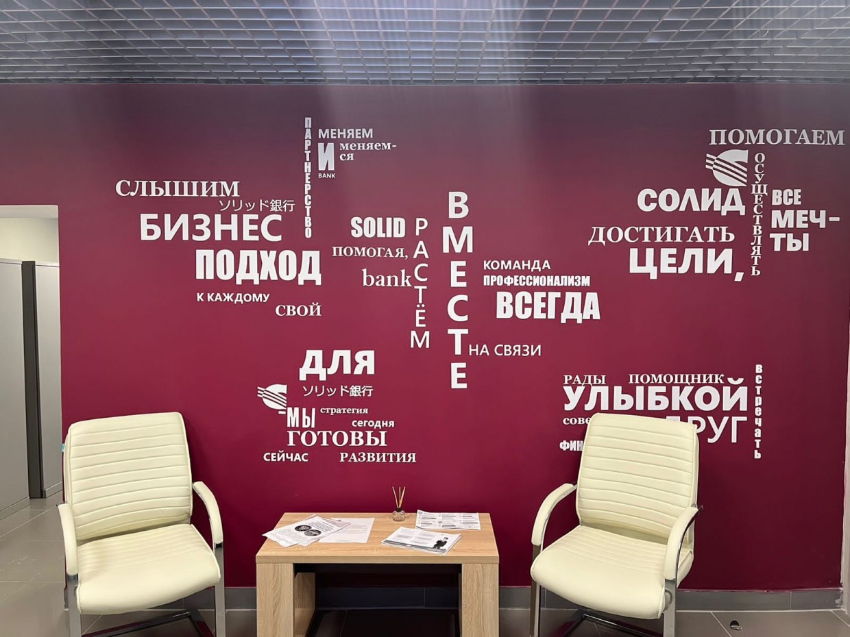 АО «Солид Банк» — это универсальное финансово-кредитное учреждение, предоставляющее обширный пакет банковских услуг для индивидуальных и корпоративных клиентов различных форм собственности и видов деятельности. Уже более 30 лет Солид Банк помогает бизнесу достигать цели, а частным лицам осуществлять свои мечты. Для этого в арсенале финансового учреждения есть оптимально-подобранный комплекс услуг. Офисы банка расположены в городах: Москва, Тула, Екатеринбург, Уфа, Казань, Ижевск, Альметьевск, Иркутск, Якутск, Хабаровск, Благовещенск, Комсомольск-на-Амуре, Владивосток, Петропавловск-Камчатский, Елизово, Палана, Северо-Курильск, Санкт-Петербург.